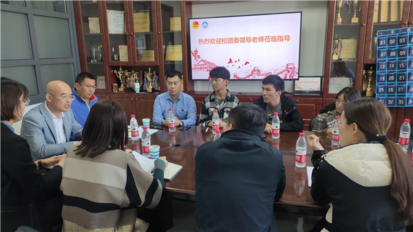 10月21日中午,校团委副书记孙涛、组织宣传部部长郑兴燕、素质拓展部干事关晓晨、校团委组宣部副部长张凯月(学生团干部)一行来我院就共青团工作开展情况进行调研、座谈。学院党委副书记兼副院长聂国东、学办主任梁媛、团委书记李东海、辅导员代表及学生代表参加调研座谈。