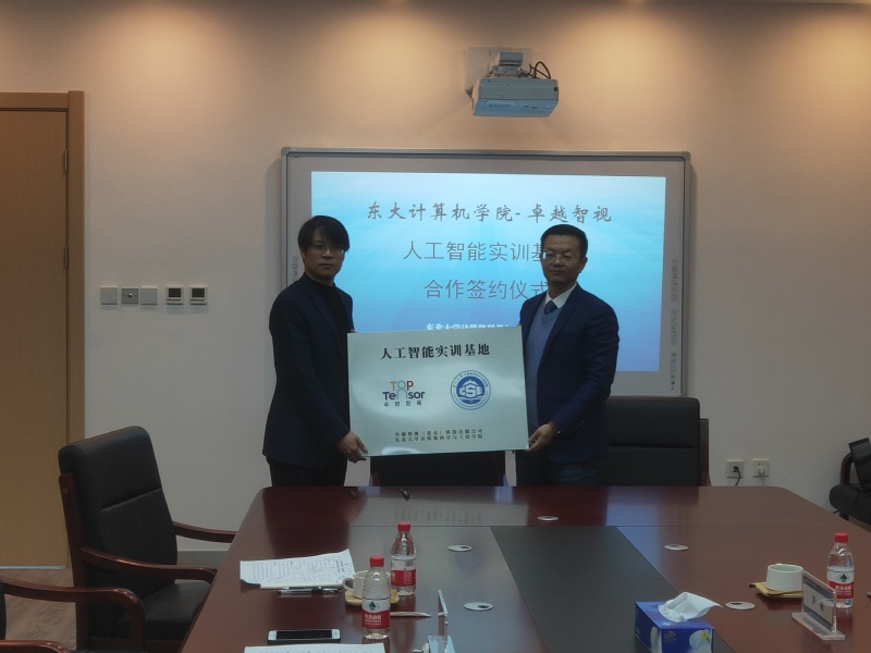 杨金柱和韩立明分别代表双方签署了战略合作框架协议和捐赠协议,同时为人工智能实训基地揭牌,标志着东大计算机学院-卓越智视人工智能实训基地的正式成立。