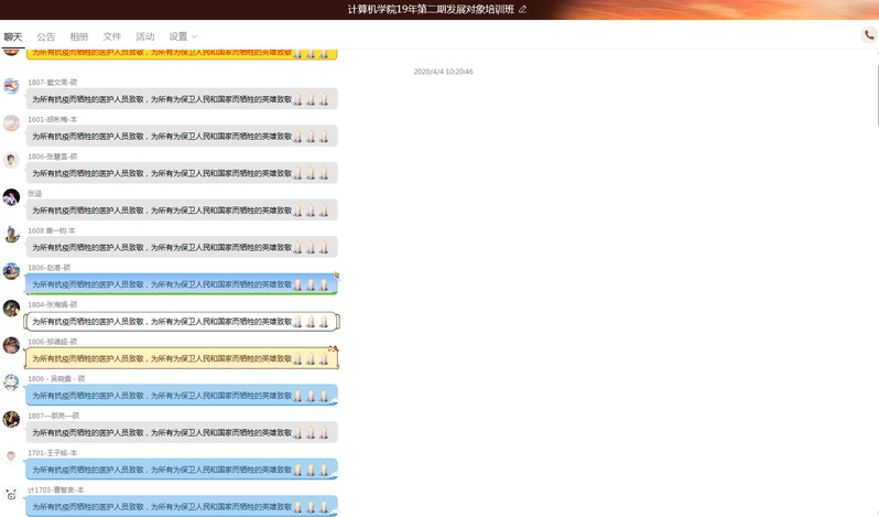 本次活动主要分为两个部分:“网上祭英烈”和观看纪录片《英雄之城》。一束黄菊祭英魂,一杯浊酒思亲人,为追悼抗击新冠肺炎疫情斗争中牺牲的烈士和逝世同胞,全体学生预备党员在参加全国性哀悼活动后,通过在QQ群上开展“网上祭英烈”活动,表达对英烈的深切哀思和崇高敬意。在武汉“开城”前夕,组织预备党员同学们线上观看抗疫纪录片《英雄之城》。一同回顾了在武汉“封城”期间,医生、护士、快递员、志愿者、社区工作者们为抗疫做出的贡献。观看结束后,同学们纷纷发表自己的感受,硕士1802班的张胜楠同学表示:每一个逆行者,都是中国的英雄,作为一名预备党员,我们更要在关键时刻勇往直前,在国家危难时挺身而出,站在自己的立场上,尽我们的义务;硕士1807班的窦文周同学说:感受到了医护人员在这次疫情阻击战中的巨大贡献,作为一名预备党员,要学习他们英勇奉献的精神,时刻以党员的标准严格要求自己。
