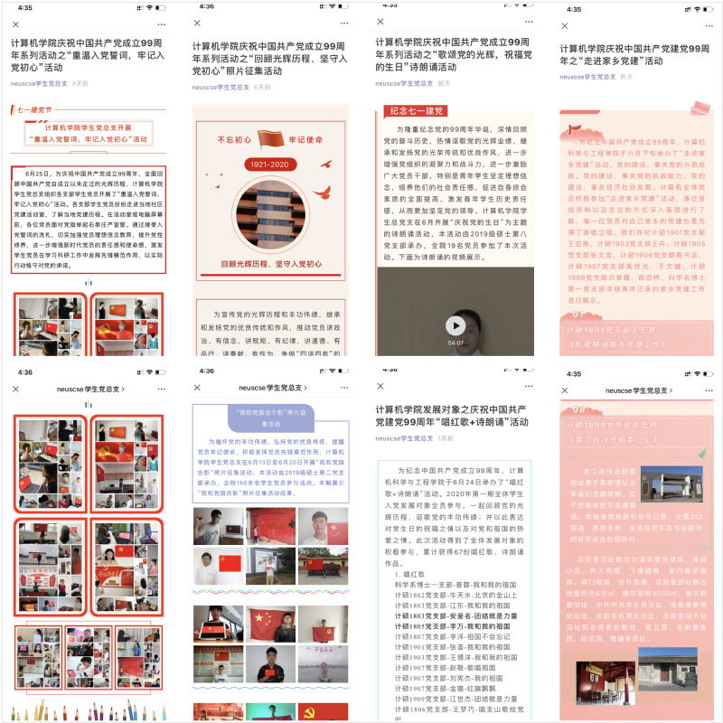 为热烈庆祝中国共产党成立99周年,深情回顾党的奋斗历史,热情讴歌党的光辉业绩,继承和发扬党的光荣传统和优良作风,我院学生党总支组织策划了“忆党史、铭党恩,强党性、促党建”庆祝中国共产党成立99周年系列活动,进一步激励广大青年学生党员坚定理想信念,增强党性意识、宗旨意识和奋斗意识。具体活动包括:“我和党旗合影”照片征集、“回顾光辉历程,坚守入党初心”照片征集、家乡党建工作解说、重温入党誓词、纪念七一建党”诗朗诵、“唱响爱党‘九九’情”党员唱红歌、99周年重大党史事件讲解、“建党99周年”给党送祝福、“回顾党的政治工作发展史,常学常新记录新感悟”学习笔记分享等9项系列活动。