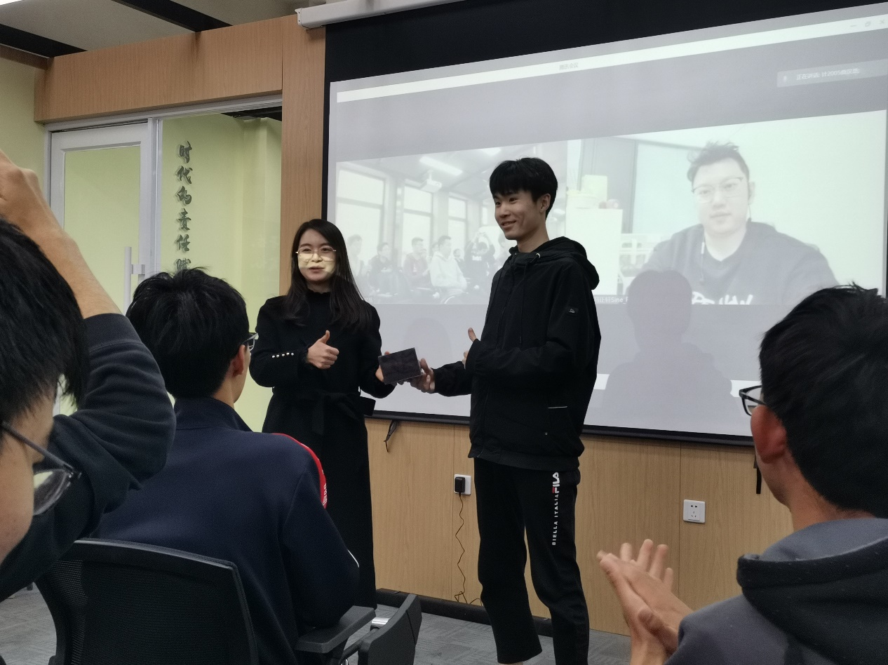 班会的最后是颁奖环节,按照班级量化积分制度,由辅导员宋宁宁代表企业班导师冯正轩为计算机类I2005班获奖的曲汉岳和金智勇两位同学进行颁奖。