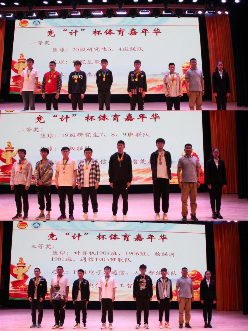 本次竞“计”杯之三大球联赛共设篮球、足球、排球三类项目。篮球联赛冠军队伍为20级硕士研究生3、4班联队,亚军队伍为19级硕士研究生7、8、9班联队,季军队伍为19级本科生计算机04、06班、物联网01班、通信03班联队;足球联赛冠军队伍为硕士研究生联队,亚军队伍为17级本科生联队,季军队伍为19级本科生电子、通信、人工智能联队;排球联赛冠军队伍为硕士研究生联队,亚军队伍为19级本科生电子、通信、人工智能联队,季军队伍为20级本科生电子信息、人工智能联队。