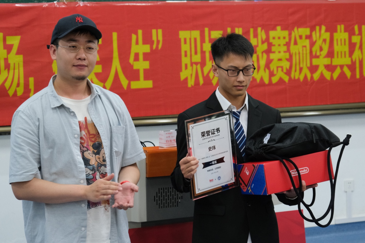 典礼中,吕博斯为“闪耀职场,微笑人生”职场挑战赛中获奖同学颁奖。