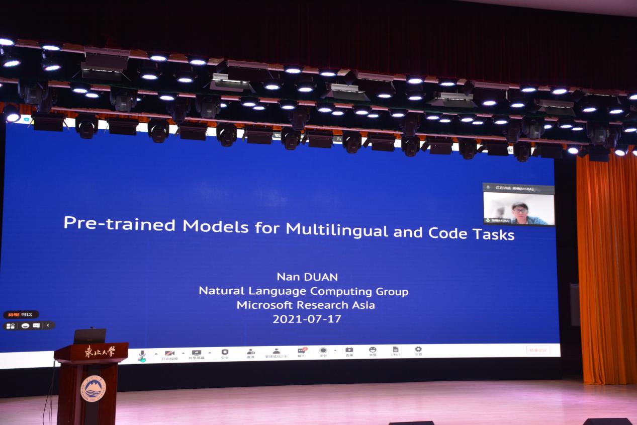 开幕式最后,王义和微软亚洲研究院高级研究员、天津大学兼职教授段楠进行了线上学术报告。王义对多核嵌入式计算机系统进行了简单介绍,由芯片讲起逐步过渡到多核计算机系统,最后对实践营同学寄予了殷切的期望。段楠就“Pre-trained Models for Multilingual and Code Tasks”展开了详细的讲解,对一些概念理论图进行了细致分析,实践营的同学们受益匪浅。