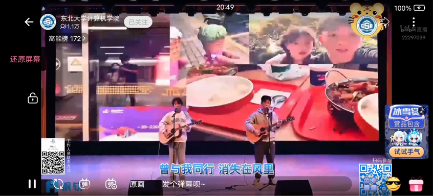 在晚会正式开始之前,播放了由我院师生录制的新年祝福暖场视频,营造了温暖和谐的气氛。本次晚会分为“忆往昔峥嵘岁月,扬帆起航”“礼赞壮志正少年,劈波斩浪”“梦想坚守当此时,不忘初心”“万户灯火总温情,春暖神州”四个篇章,包括器乐演奏、乐队合唱、小品朗诵等共13个节目。随着同学们的精彩表演,晚会气氛高潮迭起,弹幕中洋溢着观众对节目的赞美与喜爱之情。