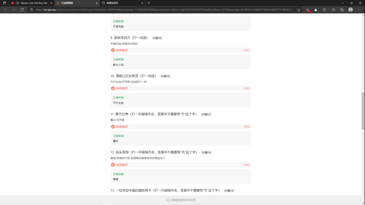 2月15日晚7点,参加“灯谜猜猜猜”活动的学生,准时守候在屏幕前,运用文学素养,充分发挥想象力,踊跃作答,争取用最短的时间拿到最高的分数。 这场脑力竞技不仅是对同学们知识储备,临场反应的挑战,更帮助同学们对中华传统文化有了进一步的理解与探索。在本次比赛中,苗佳获得一等奖,李雨桐、陈小宇、刘登栓获得二等奖,赵俊淇、冯德蕾、刘卢航、柏甜雅、董苡廷获得三等奖。