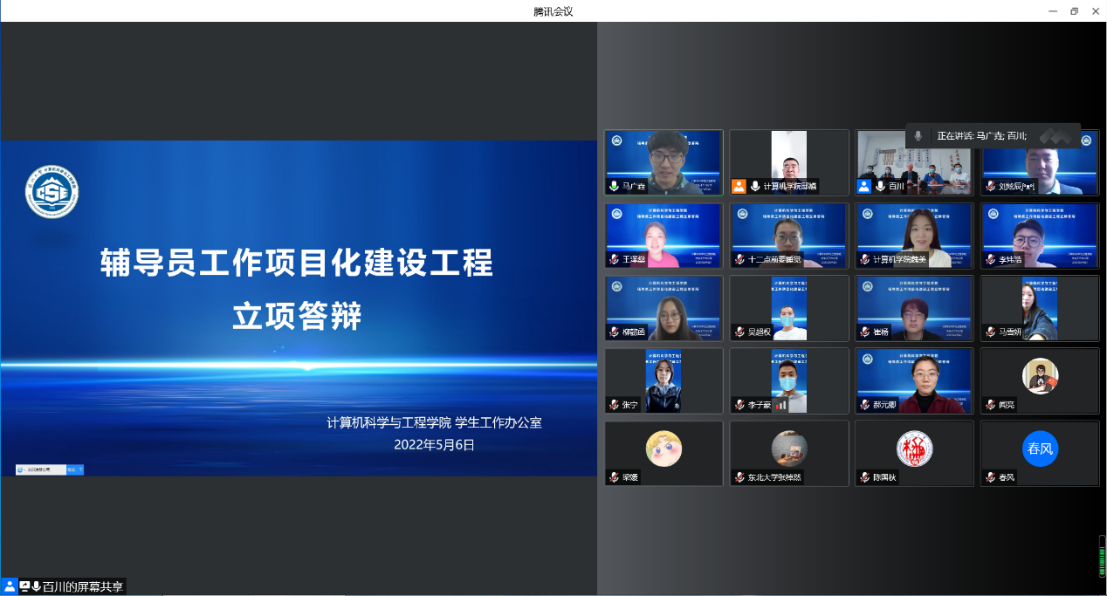 5月6日下午,我院学生工作办公室在浑南校区五舍A220会议室举行第七期“辅导员工作项目化建设工程”启动会。此次启动会采取线上线下相结合的方式,学院党委书记邸馗,党委副书记、副院长(兼)聂国东及学院全体学生工作干部参会。会议由学院团委书记李东海主持。
