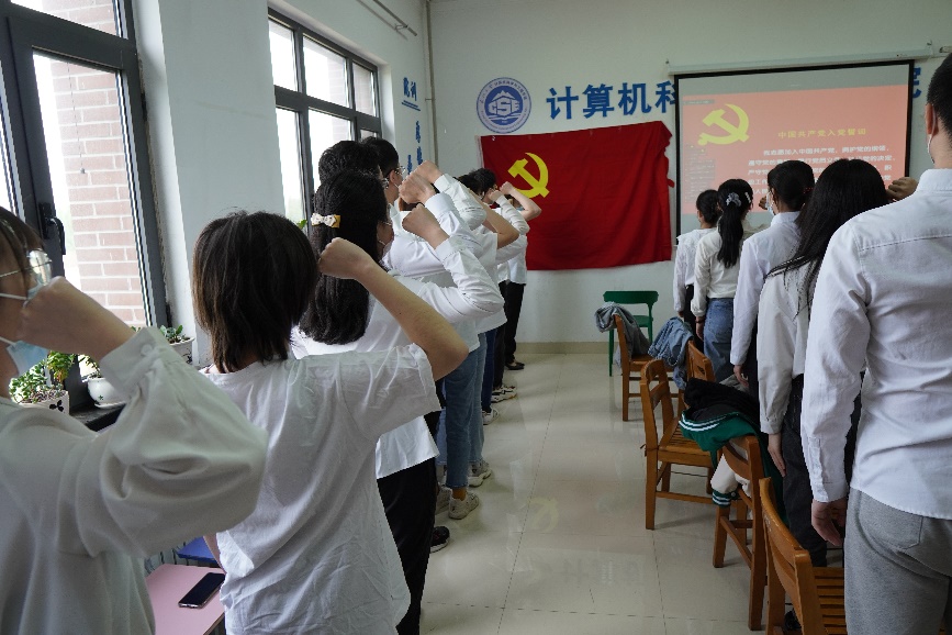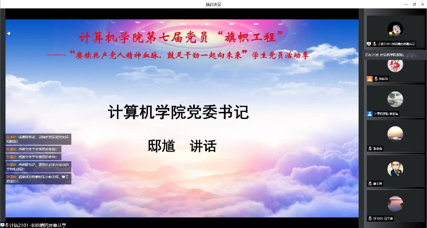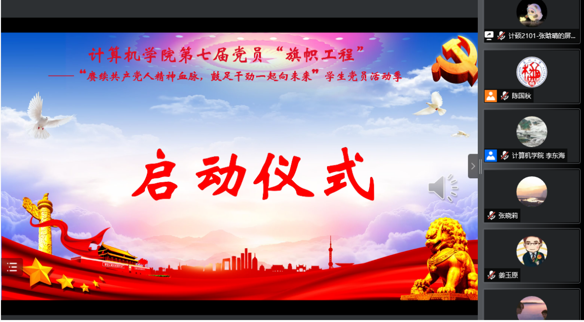 开幕式上,全体参会人员“隔空”起立,奏唱国歌。陈国秋介绍了本届党员“旗帜工程”学生党员活动季的主体活动安排与相关要求。随后党委副书记兼副院长聂国东与驻校辅导员在浑南校区五舍A353“党员之家”一同为本硕博20名新党员代表佩戴党员徽章,由计硕2101党支部书记张晗晴领誓,带领全体新党员在党旗下庄严宣誓、老党员重温入党誓词。本科生党支部学生党员马泽祺代表全体党员发言。