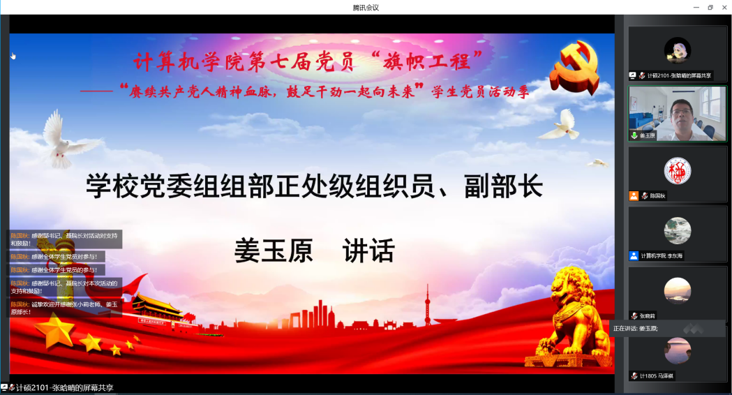 党委组织部正处级组织员、副部长姜玉原肯定了我院开展党员“旗帜工程”的重要作用与意义,表达了对我院党建工作的重视,对学生党员成长的关心,以及对全体党员同学的殷切期望。同时,他号召全体学生党员要学习习近平总书记在4月25日到中国人民大学考察调研时的重要讲话精神,他希望广大青年学生党员在社会主义现代化建设新征程中,作为青年学生中的先进分子,能够坚定信仰,积极传播、模范践行社会主义核心价值观;在向英雄、前辈、榜样学习方面,走在前,做表率;争做勇担民族复兴重任的时代新人,做到实现个人价值与社会价值相统一。