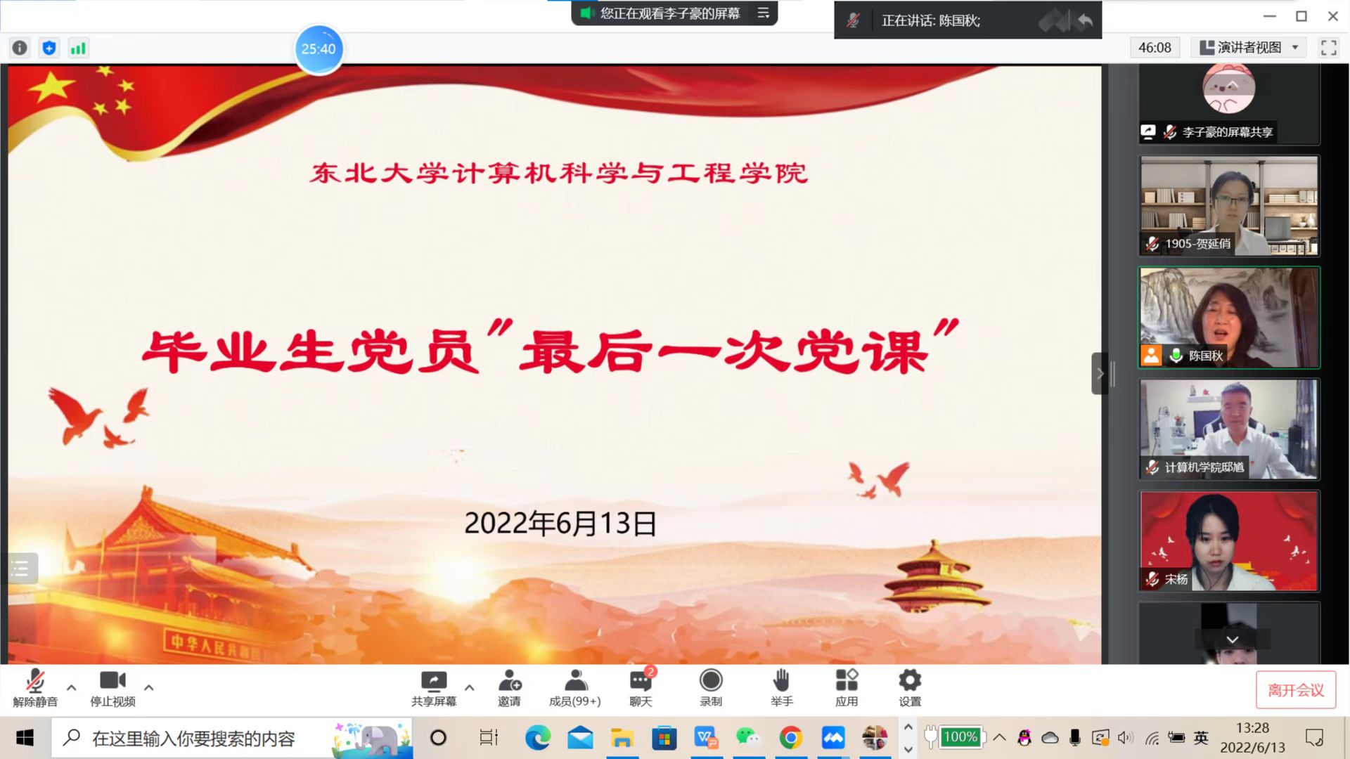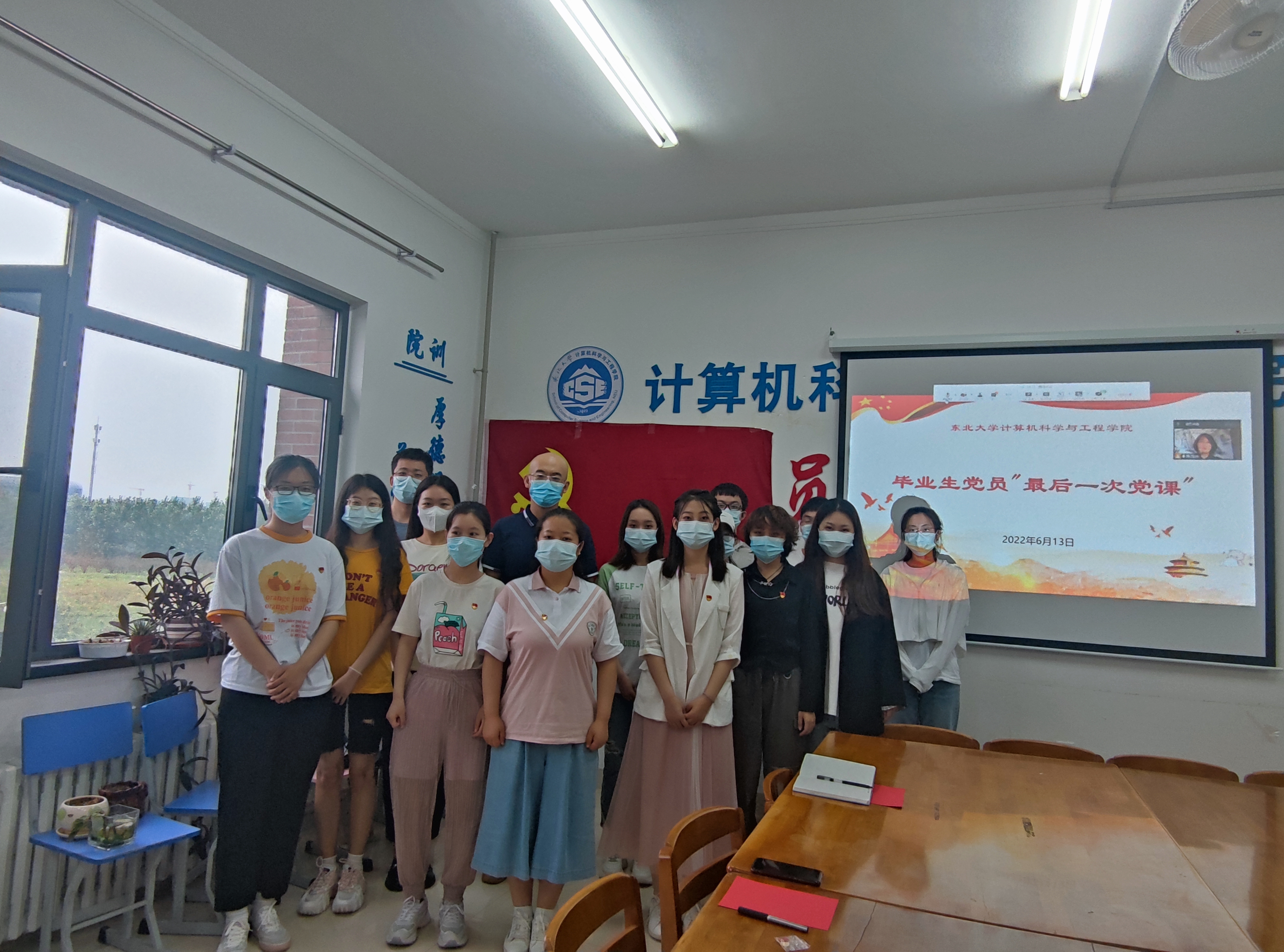 6月13日中午,我院学生党总支在必赢线路检测3003浑南校区五舍A353“党员之家”,以线上线下相结合的方式,召开毕业生党员离校前“最后一堂党课”。本次党课以“坚定理想信念,争做时代先锋”为主题,由学院党委书记邸馗主讲,学院党委副书记兼副院长聂国东、团委书记李东海、学生工作办公室副主任兼2019级硕士研究生辅导员王泽燊、2018级本科生辅导员魏美、2022届本科及硕士研究生毕业生党员共计100余人参会。会议由学院党委组织员陈国秋主持。