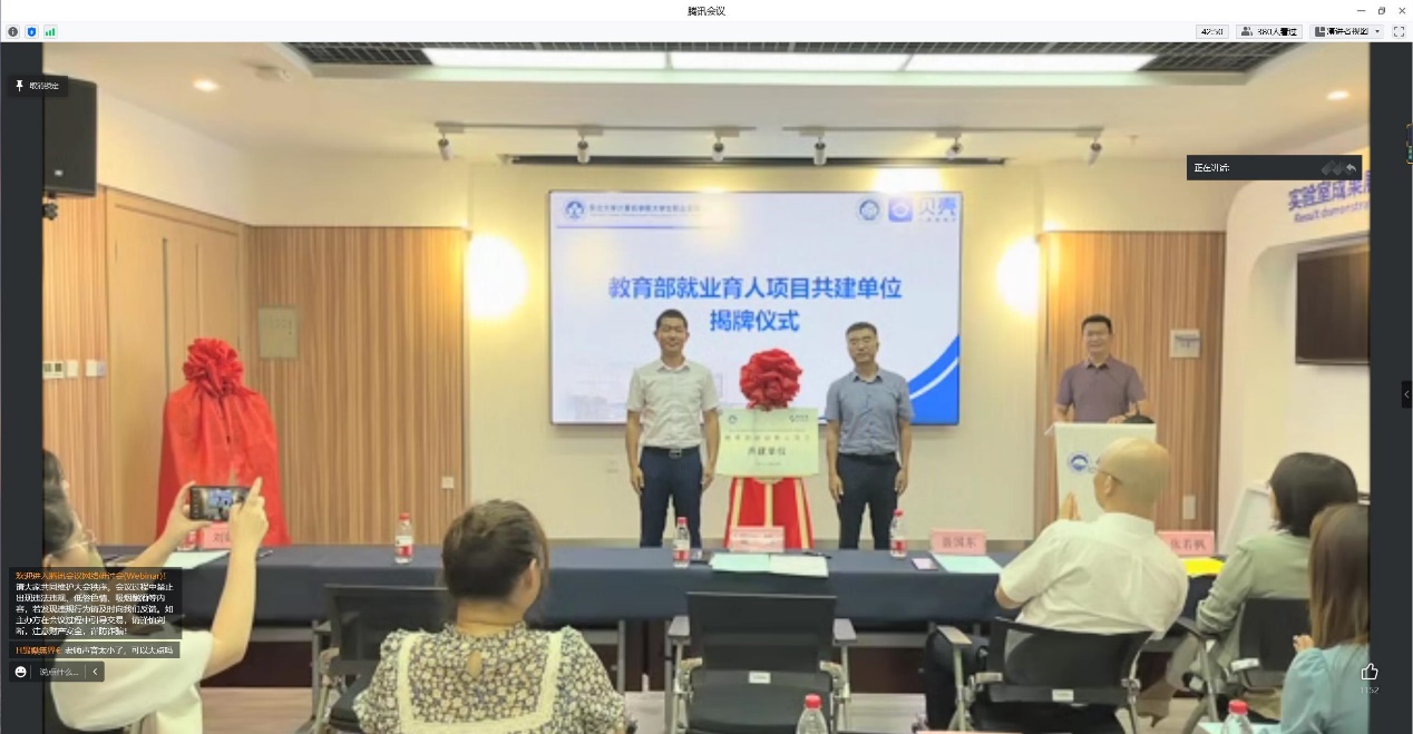邸馗与教育部就业育人项目共建单位代表共同揭开共建单位的牌匾,并进行致辞。邸馗强调了就业的重要性,肯定了企业班导师在学生就业能力培养方面的突出贡献,介绍了学院一系列对学生生涯发展有积极影响的创新性举措,对参加夏令营的同学们提出“珍惜机会,全心投入”“开拓视野、学习提升”“积极思考、知行合一”三点建议,表达了对校企合作再创新高度的祝愿。最后宣布我院“首届大学生职业发展能力提升夏令营”正式开营。