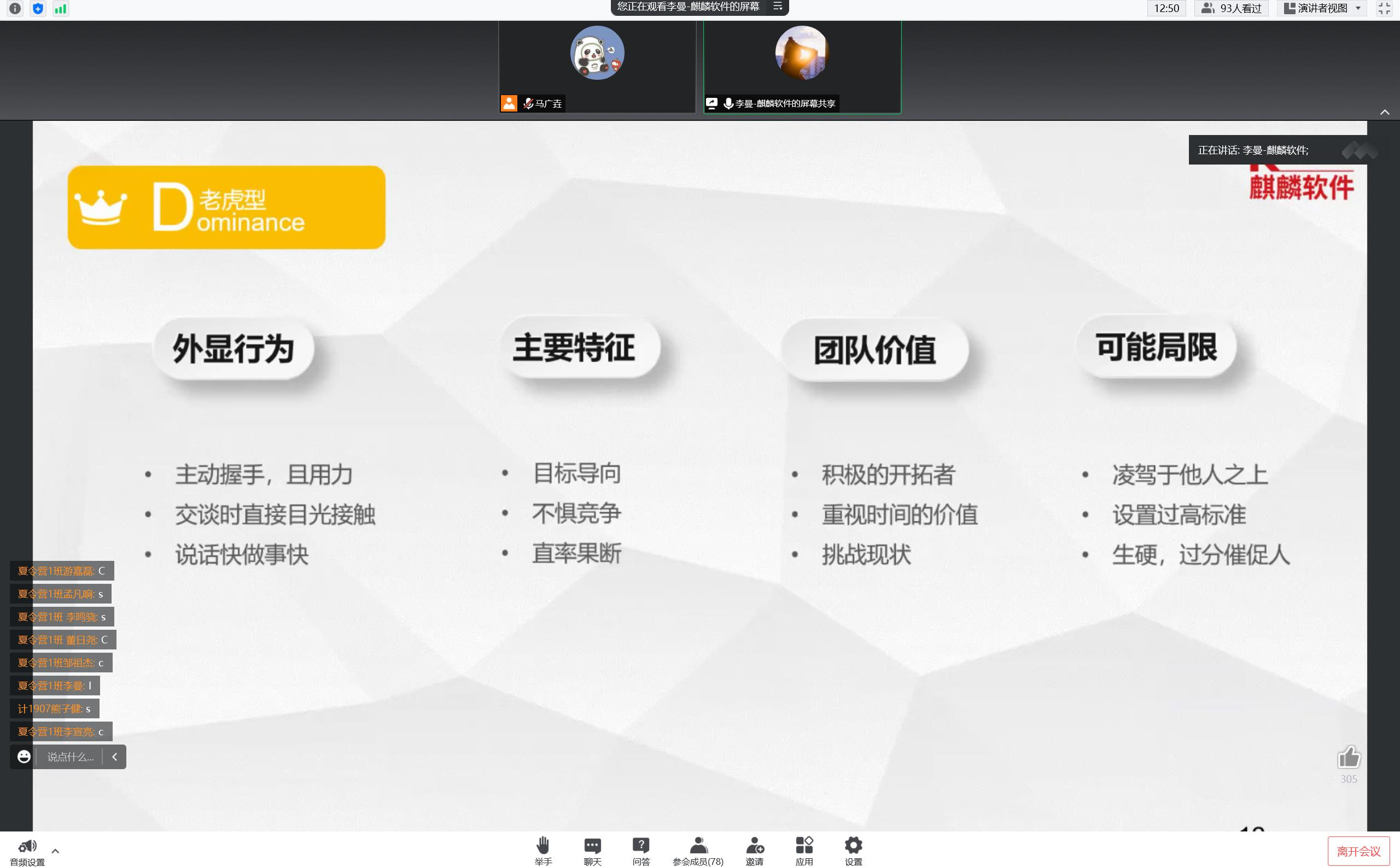 内容:李曼老师带领同学们从外显行为、主要特征、团队价值和可能局限认识分别了解、认识DISC,介绍了DISC行为风格和DISC不同性格的人在遇到赞赏、攻击、挫折等方面时展现的不同行为风格,最后一起探讨了和DISC不同的人的相处之道。