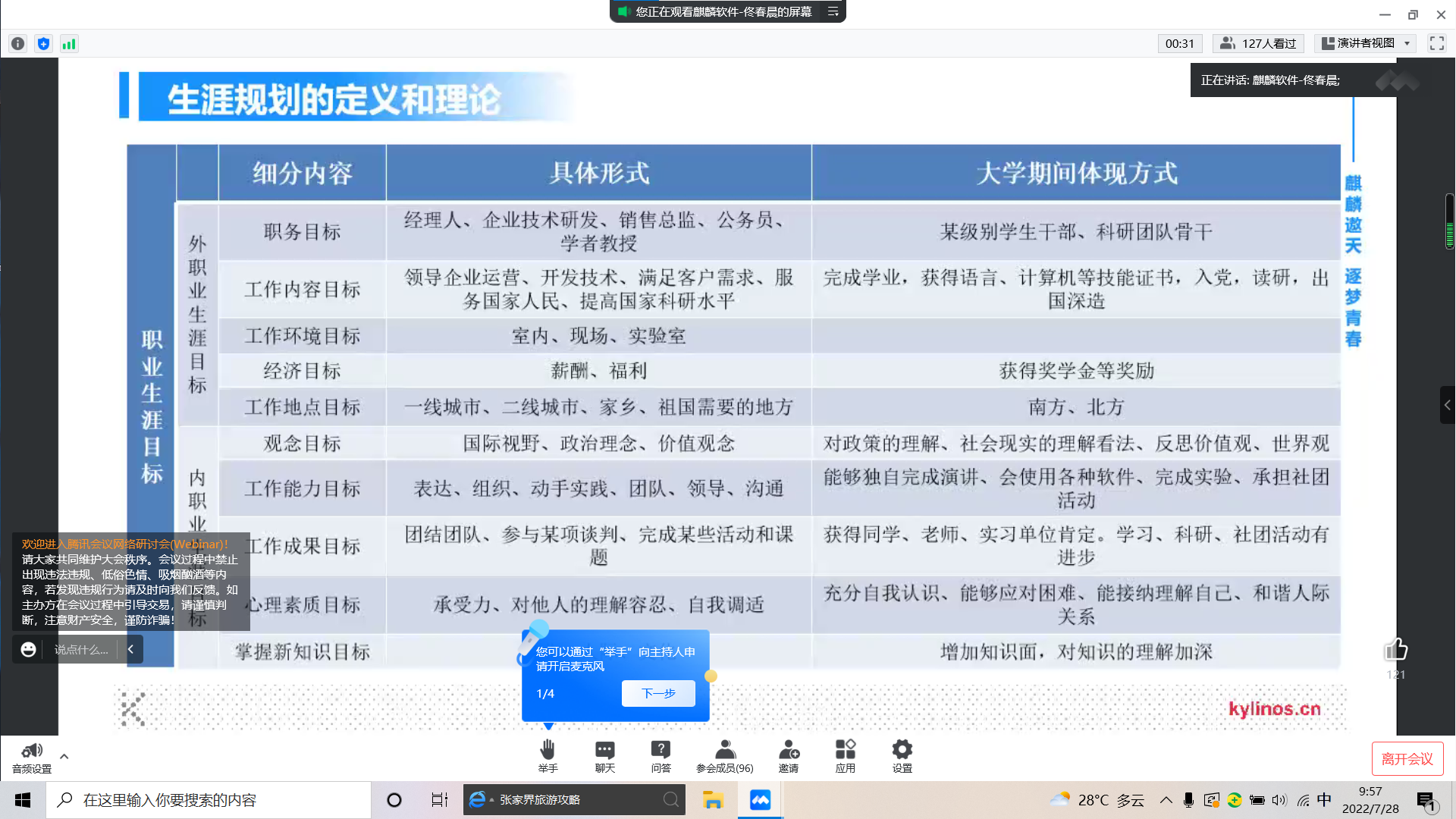 内容:佟春晨老师分享了银河麒麟操作系统和软件,并且清晰地阐述了生涯规划四部分——包括内外职业生涯规划的定义和理论、生涯规划的意义、生涯规划的步骤方法以及如何做好一个有意义的生涯规划。