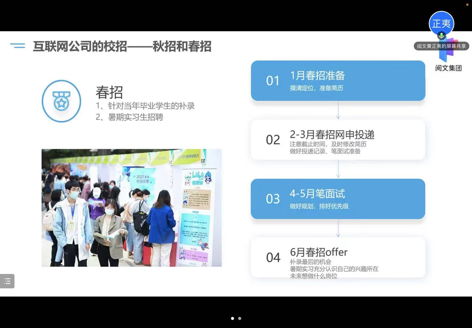 内容:黄正夷老师从互联网历史、互联网公司校招日程安排、参加春招实习的必要性、如何选择岗位、如何撰写简历和准备笔面试五个部分进行讲解,从HR的角度出发,给出了宝贵实用的备战招聘技巧和建议。