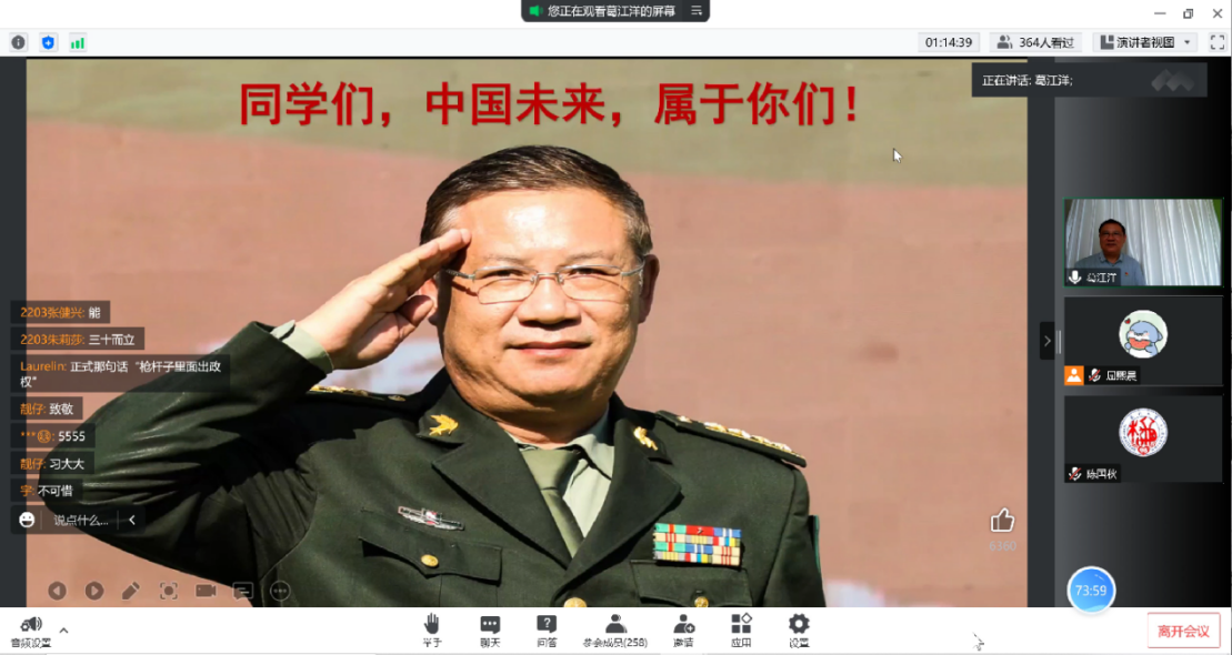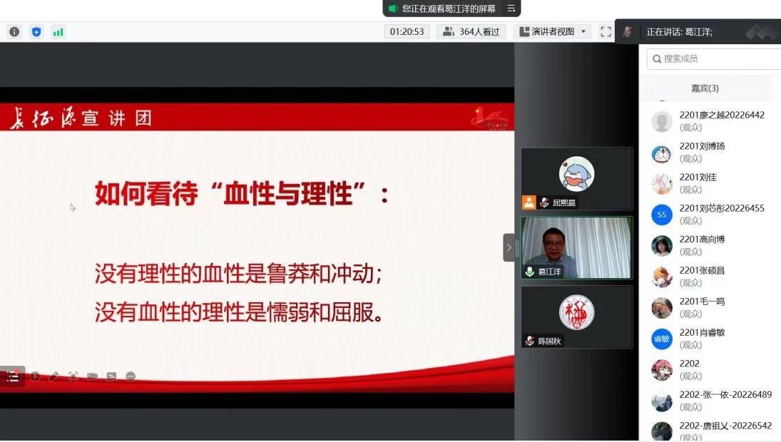 9月28日12:30,我院学生党总支邀请葛江洋担任主讲人,通过腾讯会议的方式,组织开展了以“新时代青年的‘担当’与‘自觉’”为主题的专题报告会。本次报告会由学院党委组织员陈国秋主持,本科生辅导员以及2022级本科新生500多人线上同步参会。
