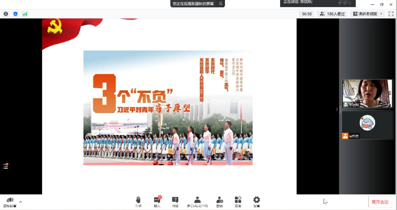 10月8日12:30,我院2022级本科新生入党“启航计划”之“初心与使命——为什么要加入中国共产党”专题报告会依托腾讯会议平台举办。此次报告会由学院党委组织员陈国秋担任主讲人,会议由2022级本科生辅导员屈熙晨主持,2022级本科500余人参加此次活动。