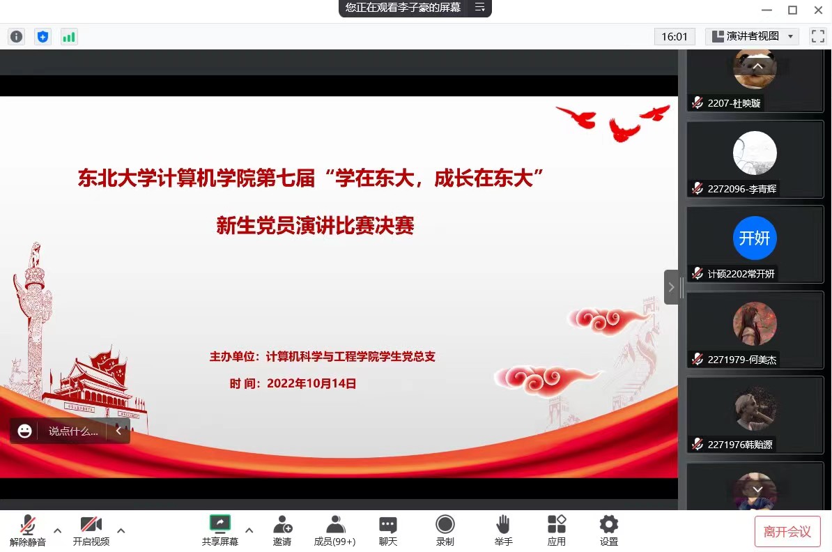 10月14日中午,我院第七届“学在东大,成长在东大”新生党员主题演讲比赛依托腾讯会议举办。本次比赛邀请中国青年小说演播家、中央政法委特邀主播、辽宁广播电视台主持人怿明老师、学院党委副书记兼副院长聂国东、学办主任梁媛、团委书记李东海和各年级辅导员老师担任评委。