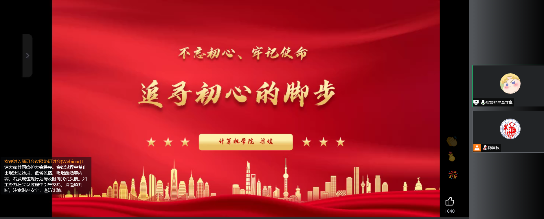 10月14日18:30,我院学生党总支以腾讯会议的形式线上举办了党员“先锋成长计划”之“追寻初心的脚步”理论专题报告会。报告会由学院学生工作办公室主任梁媛主讲,学院党委组织员陈国秋主持,300余名学生党员参与了此次活动。