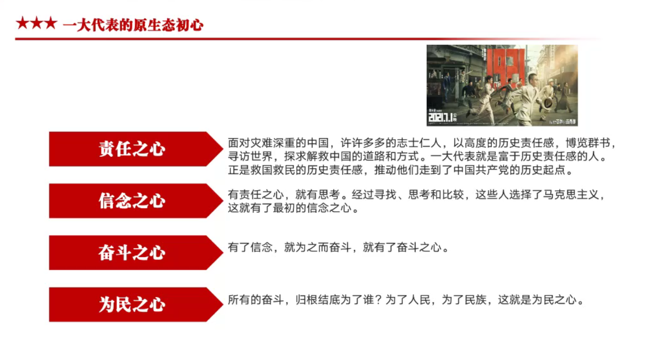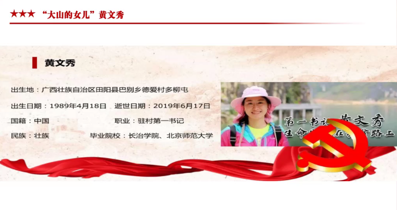 会上,梁媛围绕“共产党员的初心是什么?”这一核心问题展开详细论述。她带领青年学生党员们将视野回溯到中国共产党第一次全国代表大会,南湖红船起航,追寻先驱者原生态的初心与使命;将视野聚焦新时代“不忘初心不负芳华”的时代楷模黄文秀,感受大山的女儿入党、驻村、扶贫路上的初心;将视野回归到青年学子,分享青年学生党员如何“守初心,担使命,做青春领跑者”!