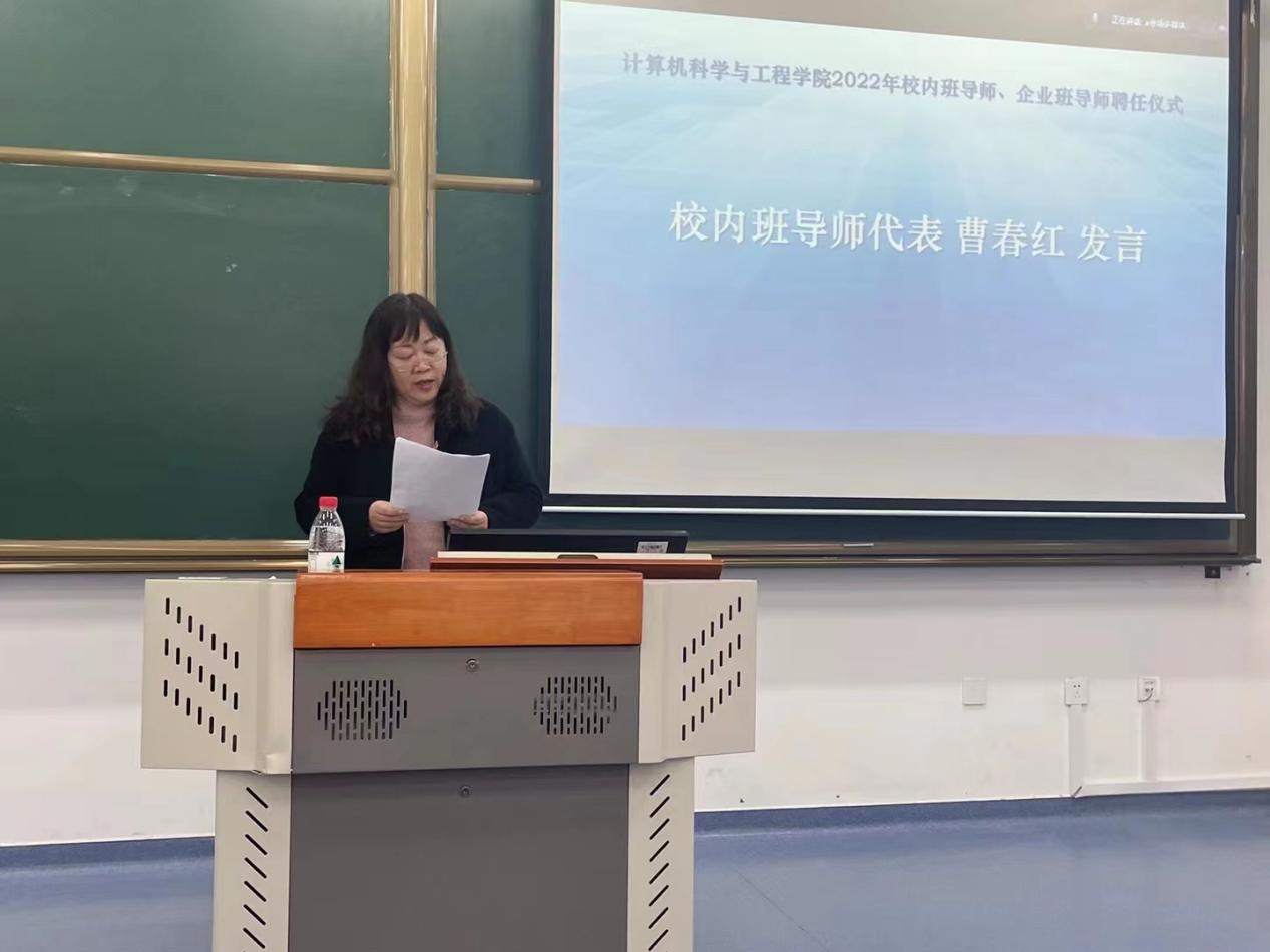 2022级本科生学生代表高一丁分享了他对班导师指导班级的感悟及畅想,表达了对班导师们的感谢。陈思含、杨牧阳作为企业班导师代表,表达了企业对学校、学院创新校企合作模式的认可和感谢;同时作为校友,以自身经历为视角,明确企业班导师的职责所在,表达了帮助学生树立正确的职业理想的决心。人工智能系教师曹春红代表全体校内班导师进行发言,她向与会班导师分享了自己几届班导师的工作经验,倡议全体校内班导师回归初心、走进学生,为培养堪当民族复兴重任的时代新人共同努力。