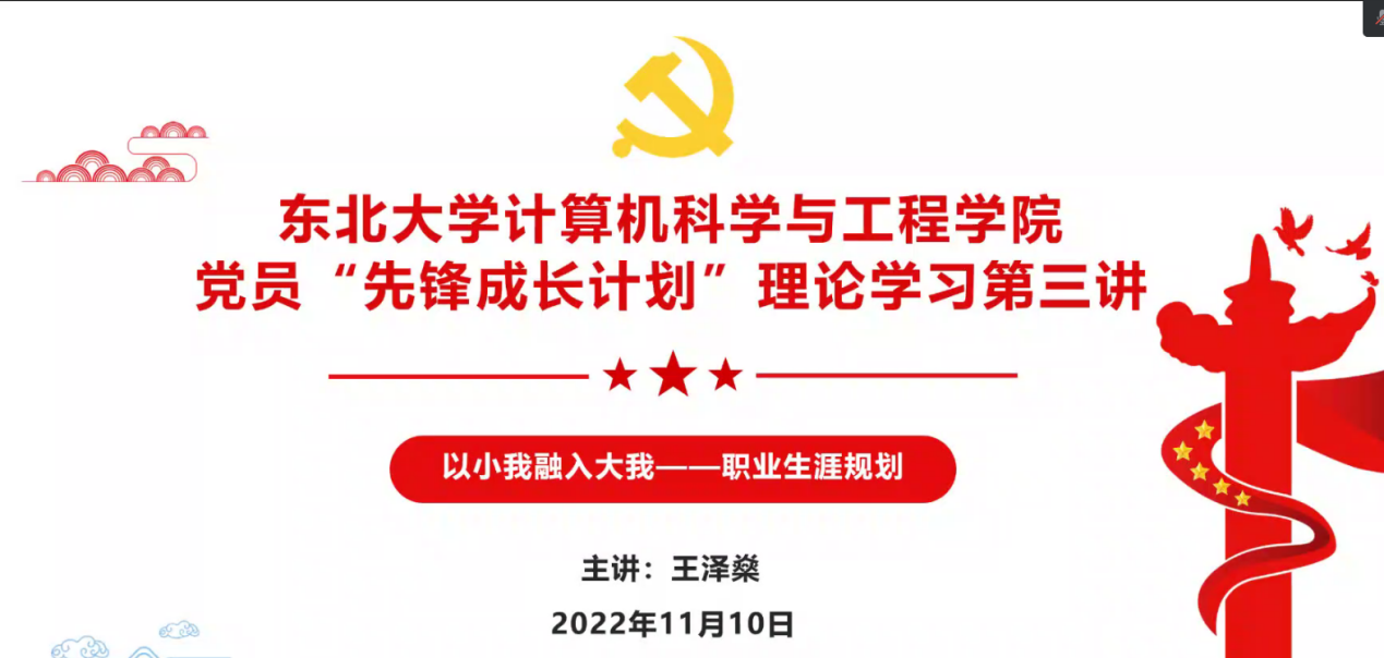 讲座中 ,王泽燊围绕“职业生涯规划”这一话题,首先带领大家回顾了2019年感动中国人物张桂梅、黄文秀的感人事迹,强调个人树立理想与目标的重要性,详细对比了基层就业、国家重点行业和大厂就业之间前景状况与工作特点,指出同学们的目标设定要符合社会需要,作为共产党员的我们更要积极地服务于国家的重点战略需求。接着,王老师针对同年级的学习特点为每个年级的本科生、硕士生分别提出了学习计划和目标实施建议,从兴趣性格探索,到技能训练,再到环境探索,逐步带领同学们认知自我,完善职业生涯规划的理念。最后,王老师向大家介绍了学院的就业指导服务,向同学们强调,要把握好当前资源,树立良好的职业观,将自己的目标设立与社会需求、国家战略相结合,以小我融入大我,在国家的现代化建设中留下自己的足迹!