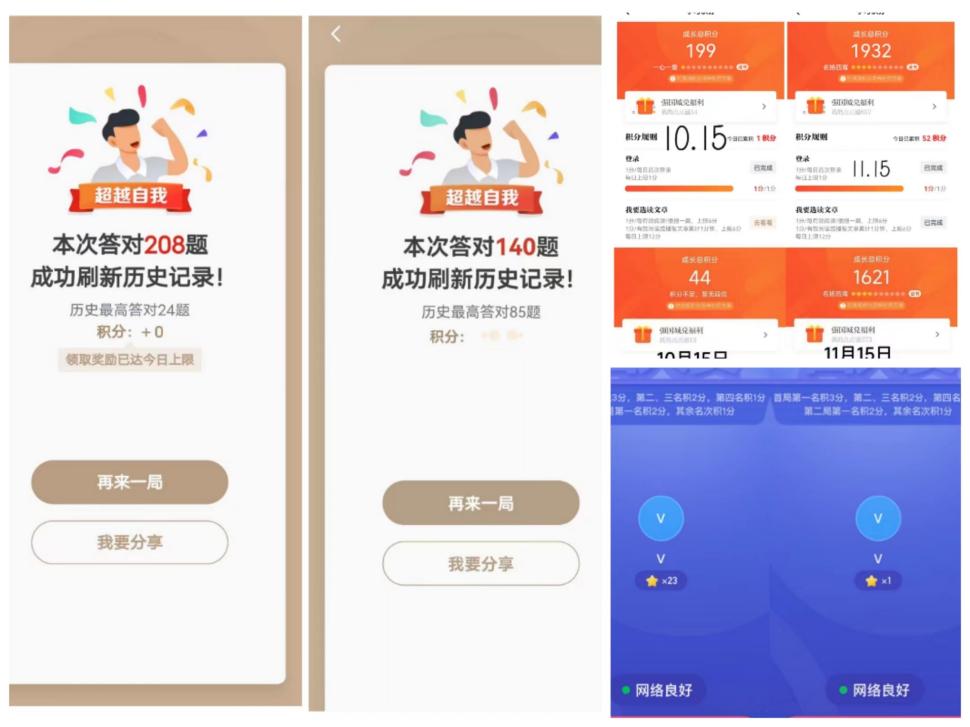 本次答题活动共采用三种类型,分别为学习强国攒积分赛、挑战答题创新高赛、四人在线对抗赛。