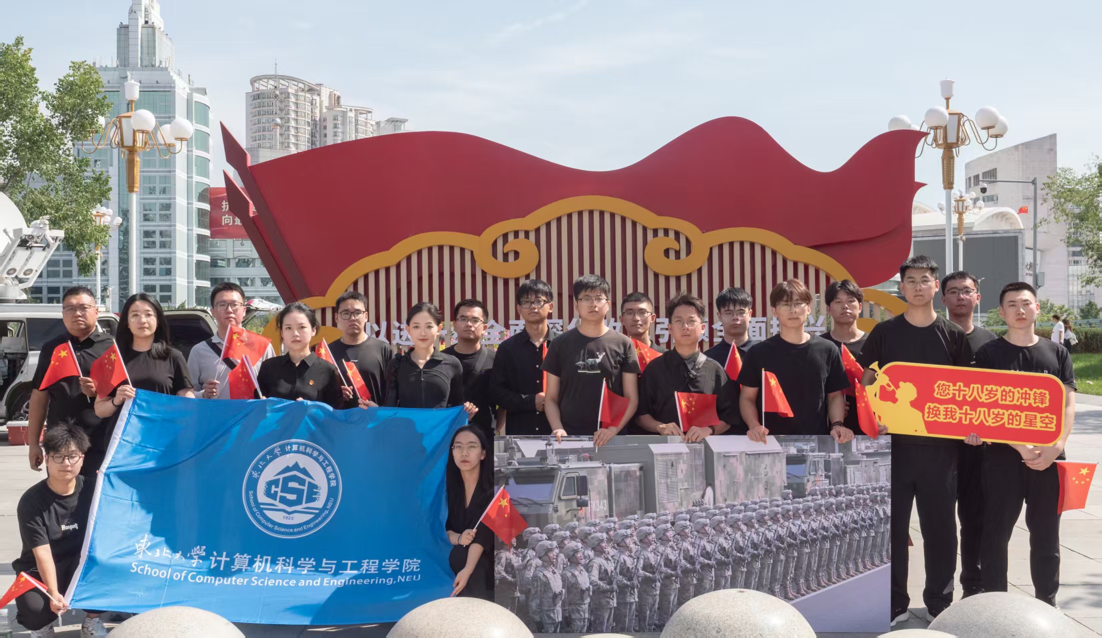 在这场跨越时空的致敬仪式中,计算机学院300余名师生自发来到青年大街沿线,手捧白菊,共擎“天地英雄气 千秋尚凛然”等横幅,目送车队缓缓驶过。烈日之下,白菊寄哀思,师生们神情肃穆,以最朴素的方式表达对英烈的无限敬意。从桃仙国际机场到抗美援朝烈士陵园,这一路,既是英雄的归途,更是民族记忆的深刻印刻。