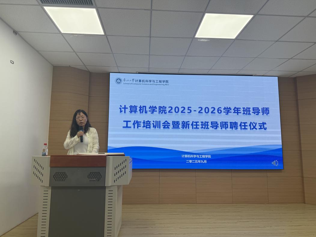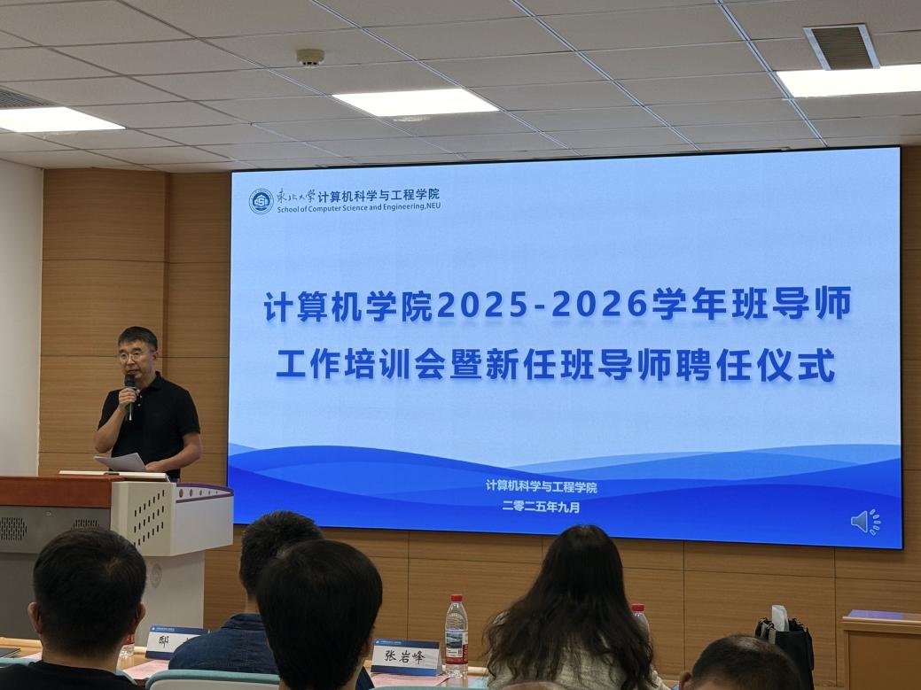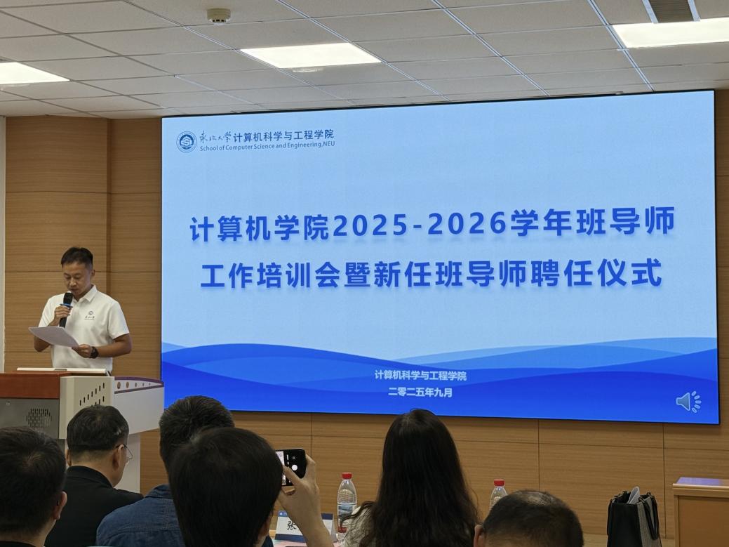 9月17日14:30,计算机学院2025-2026年度班导师工作培训会暨新任班导师聘任仪式在浑南校区信息学馆B328举行。学院党委书记邸馗、副院长张岩峰、党委副书记、副院长(兼)梁媛、学生指导服务中心心理健康教育中心副主任方婧譞,以及学院教工党支部书记、全体在任班导师、本科生辅导员参加仪式,仪式由学院学生工作办公室副主任张棹然主持。