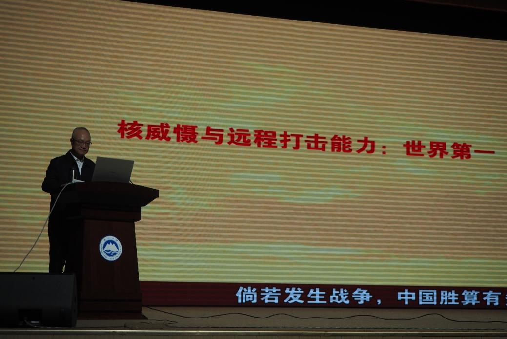 王虎强以“历史的轨迹——从血泪警示到今日辉煌”为题,从“铭记历史”和“中国军事力量的发展”两方面进行详细阐述。从“九一七”到“九一八”,他用真切的语言阐述着中国人民用血肉之躯面对敌人先进武器的历史,强调了中国共产党领导下全民族抗日的伟大壮举。王虎强带领大家回顾了九三阅兵的盛大场景,从空中作战、陆上作战、海上作战三大体系,介绍我国当今的军事实力。最后,王虎强从“一旦发生战争,我们的胜算有多大?”的角度表达我国不寻求战争,但也不惧怕战争,不畏强暴,更不畏惧任何对手的必胜决心。