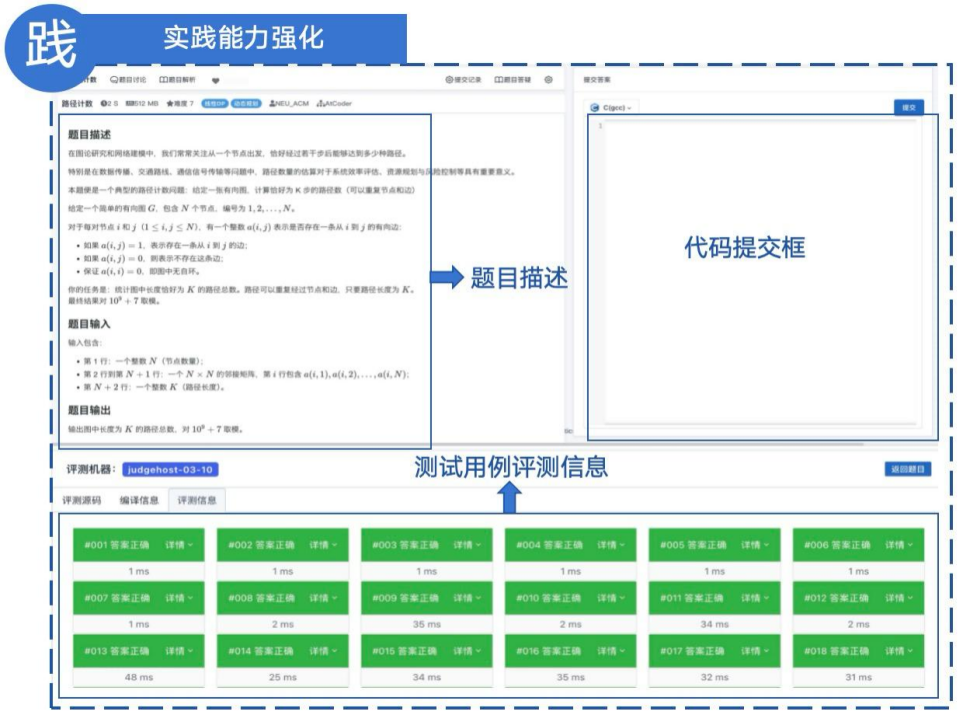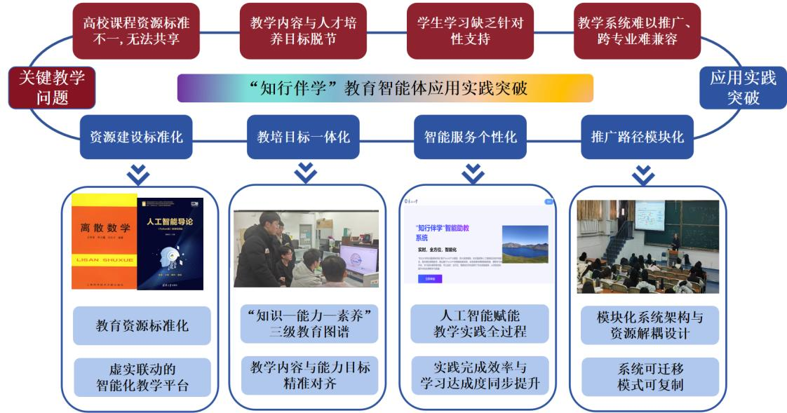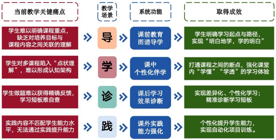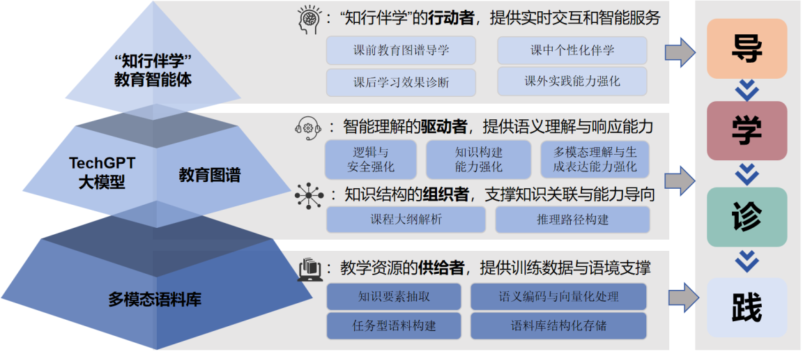 本案例聚焦学生能力培养需求,构建了人工智能全流程赋能的数智化教学体系。围绕计算机专业“导-学-诊-践”教学全流程,研究团队自主研发“知行伴学”教育智能体,在超星公司的技术协作下,融合多模态语料库、教育图谱与TechGPT大模型技术,支撑多专业课前教育图谱导学、课中个性化伴学、课后学习效果诊断、课外实践能力强化等四大教学环节,有效推动人才培养向数字化、智能化、个性化方向转型。