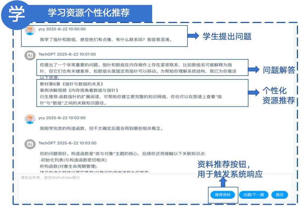 课中,“知行伴学”教育智能体结合教育图谱推理与TechGPT大模型专业适配的语义理解能力,响应学生提出的问题,并个性化推荐教材、讲义等学习资源,辅助课堂学习。